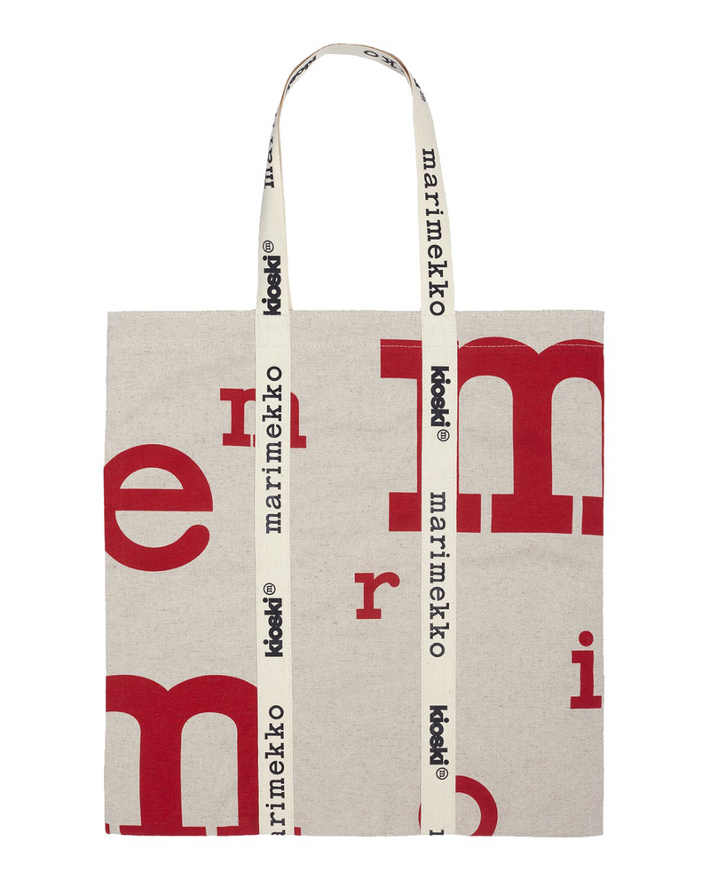 The Midi Carry Bag is made of unbleached cotton in the Marimerkki pattern, which is printed in Helsinki. The Marimekko Kioski printed straps run along the sides of the bag to form the handles. In this cheerful pattern, our widely recognizable letters float freely in many different sizes.