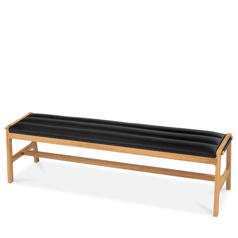 An integral part of the Arna dining series, the Arna Bench is a very popular option for alongside your dining table, against a wall in an entrance, or at the end of a bed. It is built from solid oak that has been finished with natural oil and upholstered with foam full grain black leather. It is a generous size and it has a lovely end roll detail.