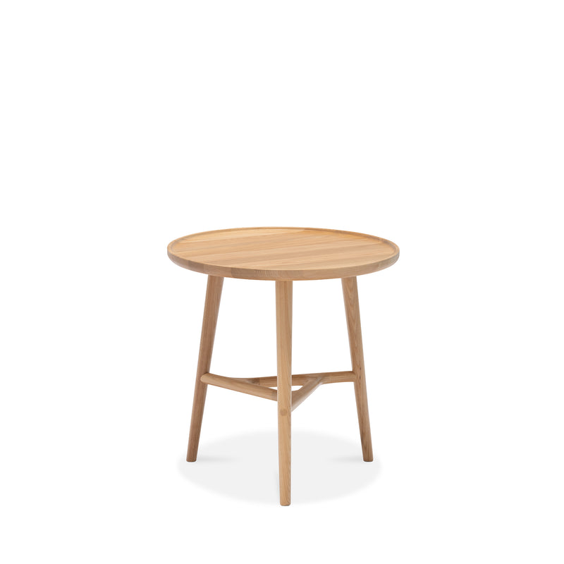 This elegant coffee table has a slim top with a lip and a tri-leg base. It is small enough to sit beside a sofa, or in a corner. It also comes with a walnut stain.