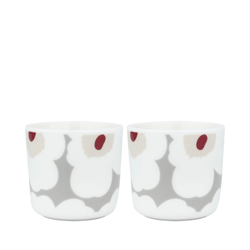 This set includes two Oiva cups without handles.  The set is packed in the Marimekko Logo pattern box.