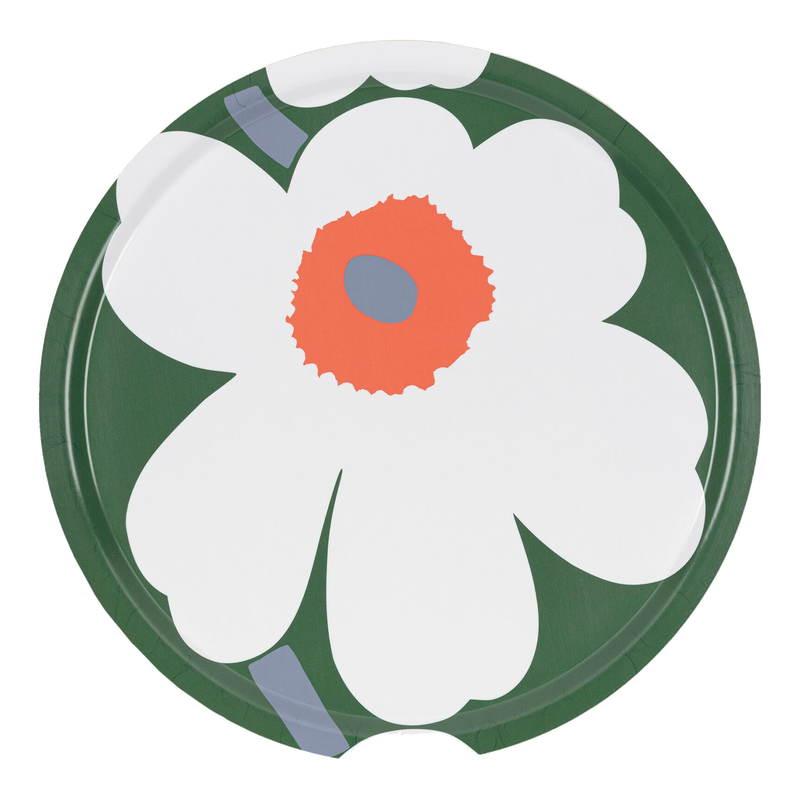 Adorned with Maija Isola's joyful poppies, this large Marimekko tray features a simple and subtle rendition of the classic Unikko print in a white, green & orange colourway. This versatile and handy tool will be perfect for serving drinks or dishes, containing clutter on a table or vanity, or as additional table space in the kitchen. This Marimekko Unikko tray is made of laminated poplar plywood, and the lightweight material is durable and easy to move back and forth. The 46cm tray is compatible with Marimekko's oak tray stand to create a convenient lifted table for additional dining where needed.