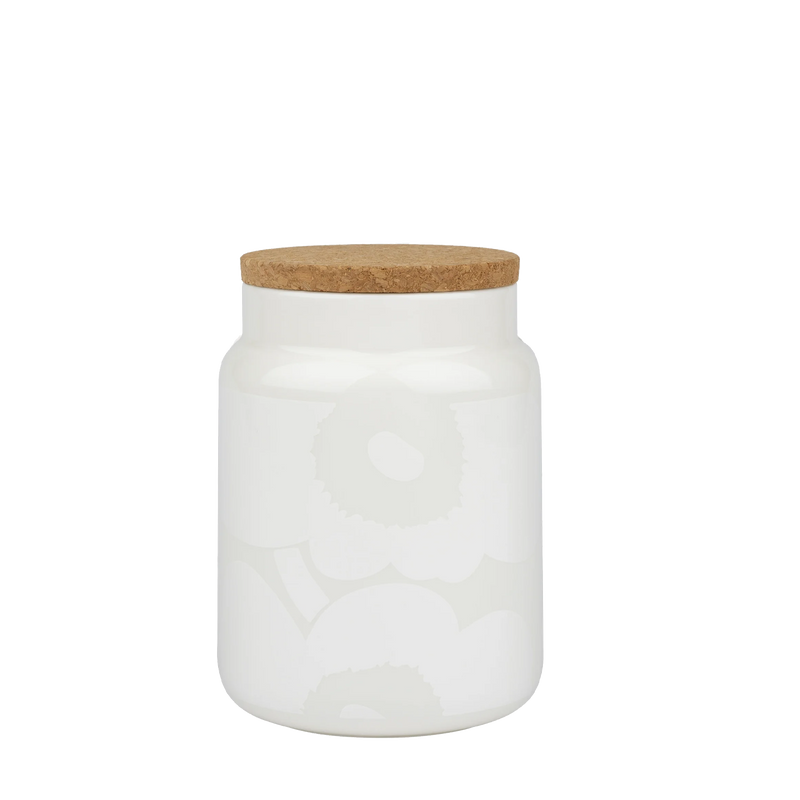 The tall white-on-white Unikko pattern jar is made of white stoneware. The jar has a cork lid, which features the Marimekko logo on the inside. We recommend washing the lid by hand.