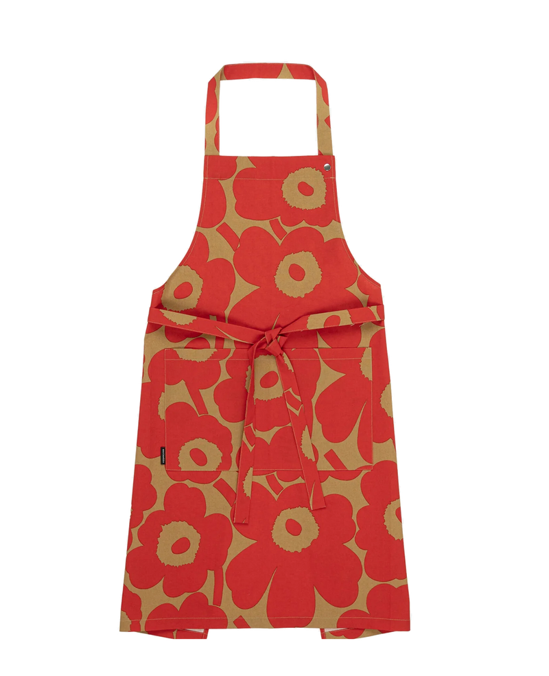 This cotton apron features the classic Pieni Unikko pattern in red. One front pocket, an adjustable neck strap and bands at the waist that can be tied together at the back.