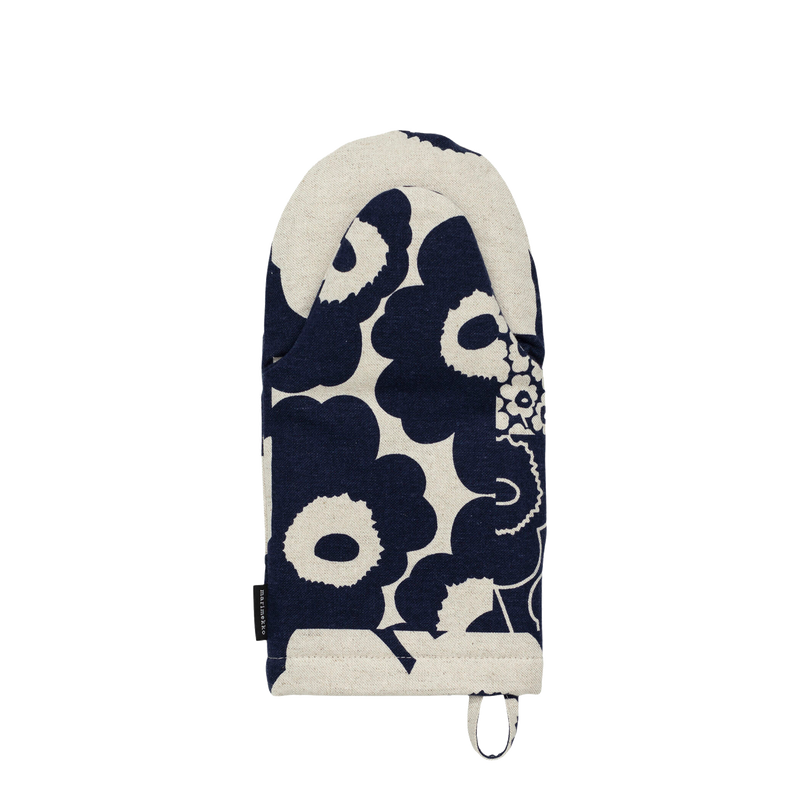 Made from unbleached cotton, this oven mitten features the Pieni Unikko pattern. The oven mitten has a padded filling and a hanging loop.