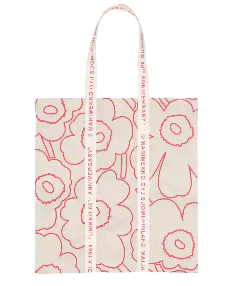The Midi Carry Bag is made of an unbleached cotton and linen blend in the Piirto Unikko pattern, which is printed in Helsinki. The "Marimekko Kioski" printed cotton straps run along the sides of the bag to form the handles.