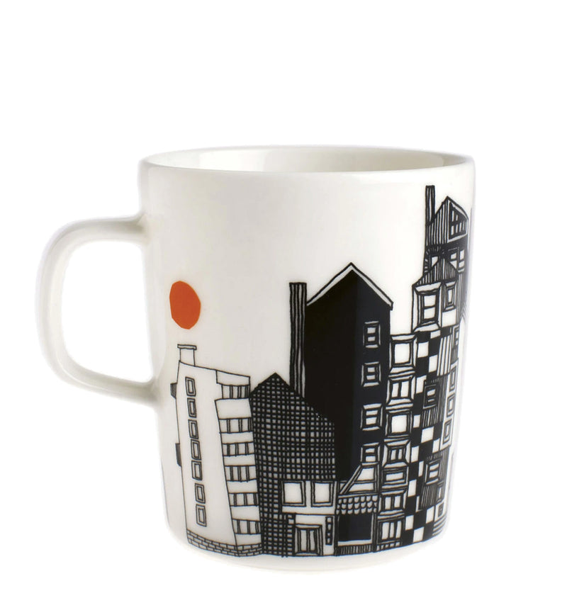 The black and white pattern on this Siirtolapuutarha mug was drawn by Maija Louekari.  It is a story that continues from one dish to another, as we journey from the city to the cottage garden.