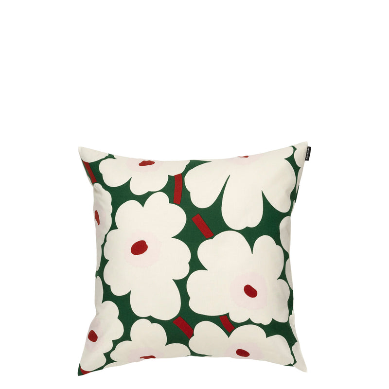 This cotton cushion cover features the Pieni Unikko pattern, which is printed in Helsinki. The cover has a zipper on one side.