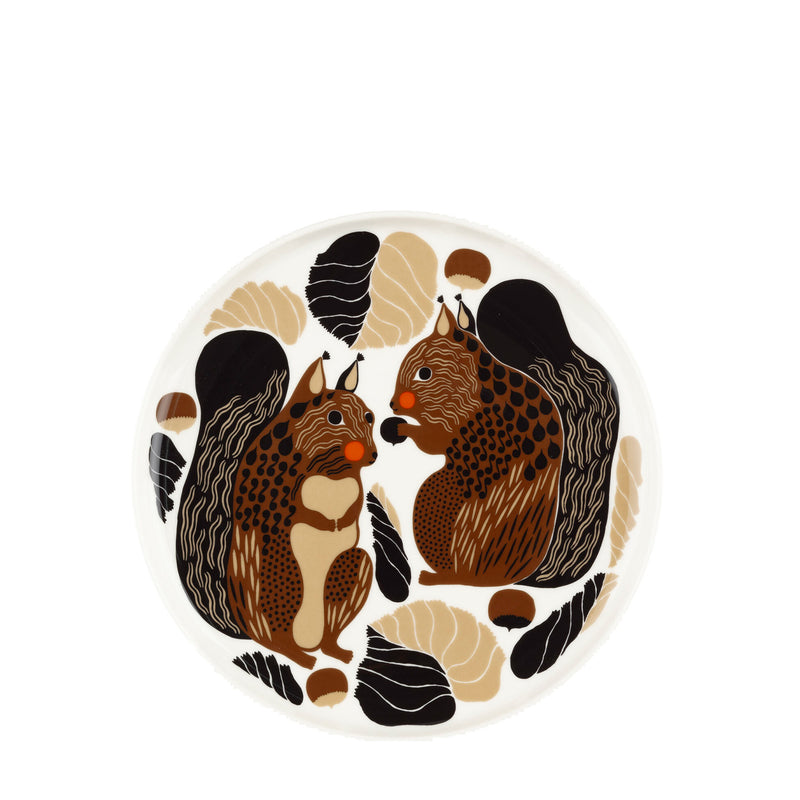 Building on Aino-Maija Metsola's enchanting forest stories, the Kurre (squirrel) pattern features a playful gathering of squirrels collecting and storing nuts. The original design was hand-painted on paper with brush and ink.