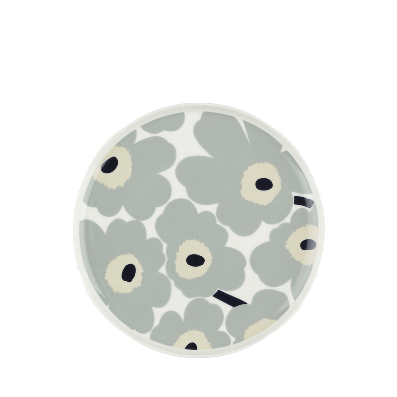 Maija Isola's 1964 poppies are featured in warm in shades of white & grey. It's perfect  for salads - but it also is ideally sized for sandwiches, snacks, and other small meals. The white stoneware is conveniently microwave, oven, freezer, and dishwasher safe to invite everyday use with convenience.