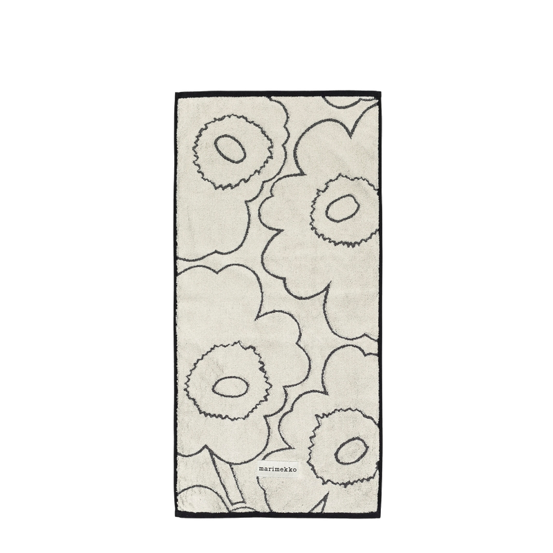 This bath towel is made of heavyweight organic cotton terry. The towel features the debossed Piirto Unikko pattern on one side and the Marimekko label on the bottom edge.