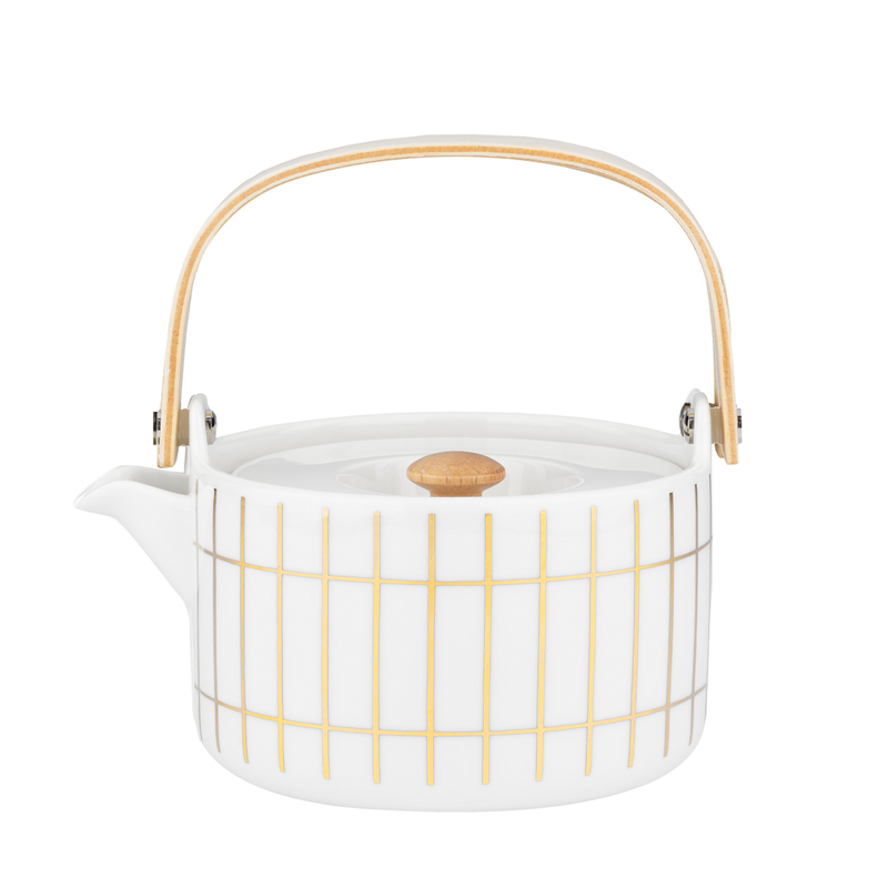 The Oiva teapot is made of white stoneware, and it features the golden Tiiliskivi pattern printed with metal pigment. The teapot has a ceramic strainer and a wooden handle and peg on the lid. Because of the metal and wooden details, we recommend washing the teapot by hand.