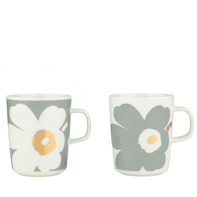 This set features two Oiva mugs made of white stoneware.  The set is packed in the Marimekko Logo pattern box.