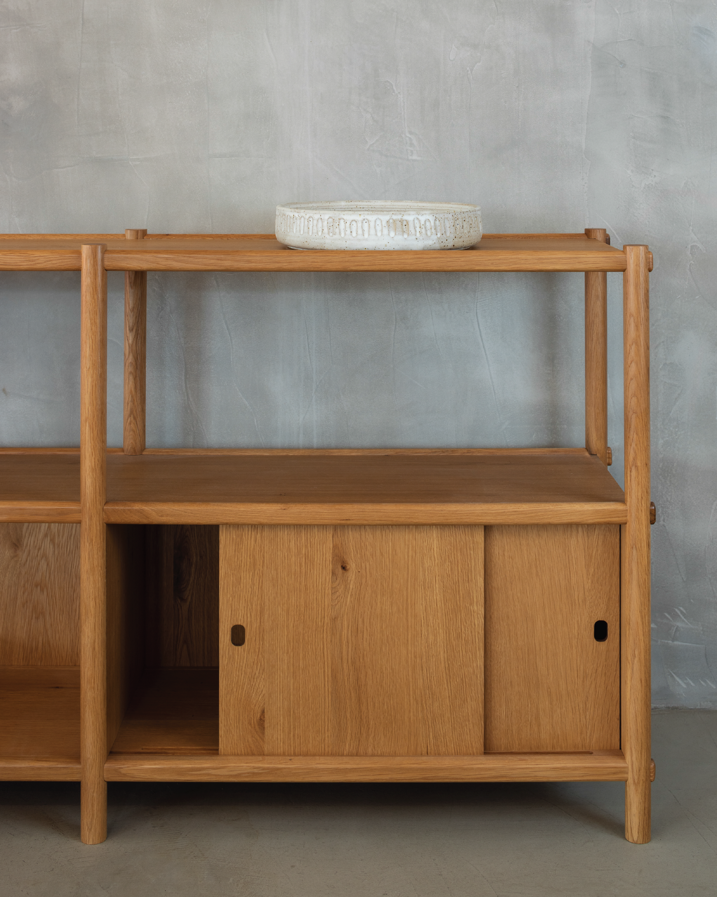 If you need a bookcase or storage solution for a tricky spot, the Arna Low Book Case may suit your needs. The low profile and round legs that frame the shelves are reminiscent of mid-century built in storage units and the subtle grain of the European oak is enhanced by a light and natural Danish oil. Two sliding doors on the right side provide hidden storage.
