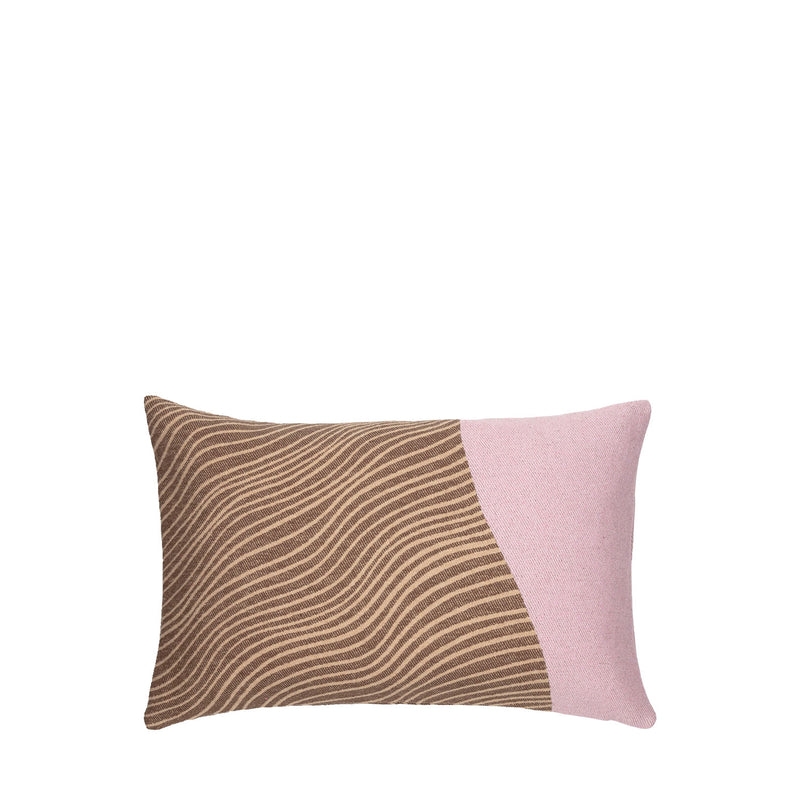Marimekko's Gabriel Näkki cushion cover is illustrated with two designs by Maija Isola from different decades in soothing shades of pink and brown. Merging together a dense, wavy striped pattern and solid surfaces, the Gabriel Näkki fusion print looks fresh and contemporary – an elegant interpretation of two classic patterns. Made of soft, warm wool blend fabric, the rectangular Gabriel Näkki cushion cover makes a cosy decorative addition to a sofa or bed.
