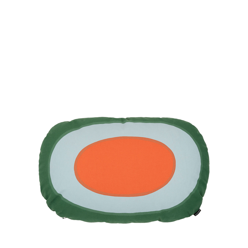 Marimekko's Melooni, Finnish for "melon", is one of Maija Isola's classic pattern designs from the 1960s. Exuding the swinging spirit of the era, the pattern consists of three oval forms in three different hues. Isola drew inspiration for the pattern from nature, as she often did in her design work, but decided to deconstruct the motif so that what was left was only an abstract, stylized design. Made of cotton and linen, the Melooni cushion has a polyester filling and a concealed zipper on one side.