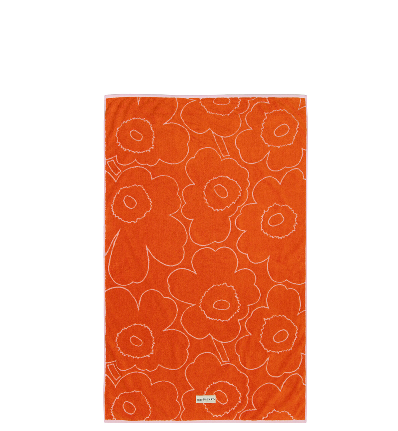 This bath towel is made of heavyweight organic cotton terry. The towel features the debossed Piirto Unikko pattern on one side and the Marimekko label on the bottom edge.